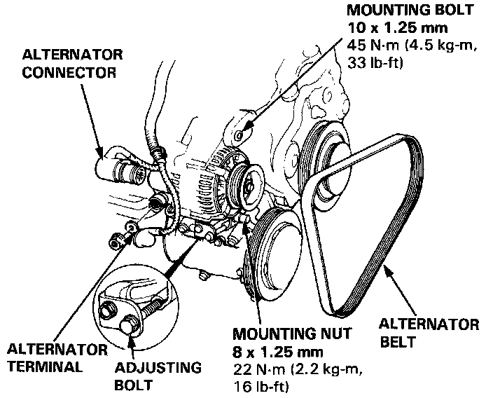 5. Loosen the alternator mounting bolt, nut and the adjusting nut, then remove the alternator belt.