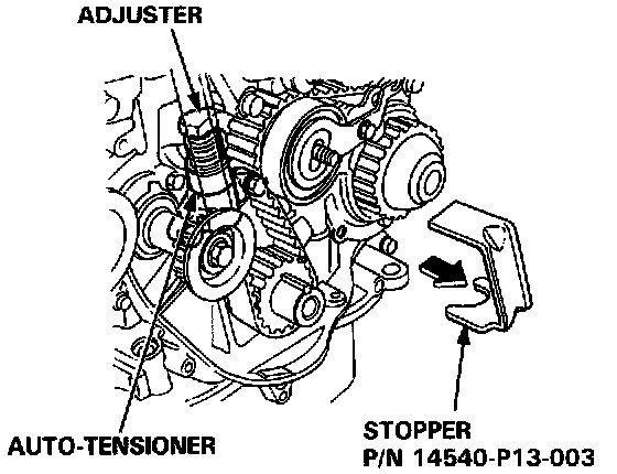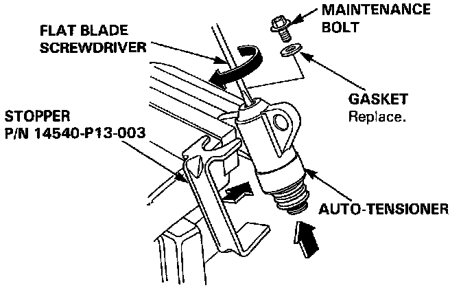 20. Insert a flat blade screwdriver into the maintenance hole. Place the stopper (P/N 14540-P13-003) on the auto-tensioner while turning the screwdriver clockwise to compress the bottom.
