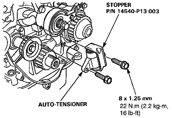 22. Make sure no oil is leaking around the maintenance bolt. Install the auto-tensioner on the engine.