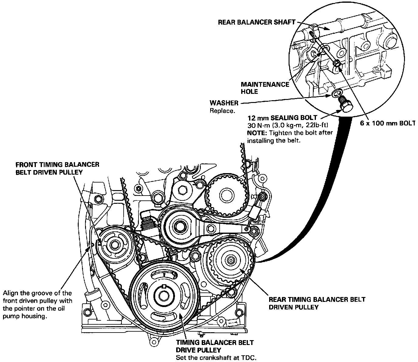 28. Install the timing balancer belt. Remove the 6 x 100 mm bolt from the rear balancer shaft.