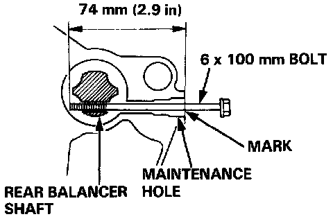26. Align the rear balancer shaft pulley by using a 6 x 100 mm bolt or equivalent as an alignment tool. Scribe a line 74 mm (2.9 in) from the end of the bolt. Insert the bolt into the maintenance hole to the scribed line.