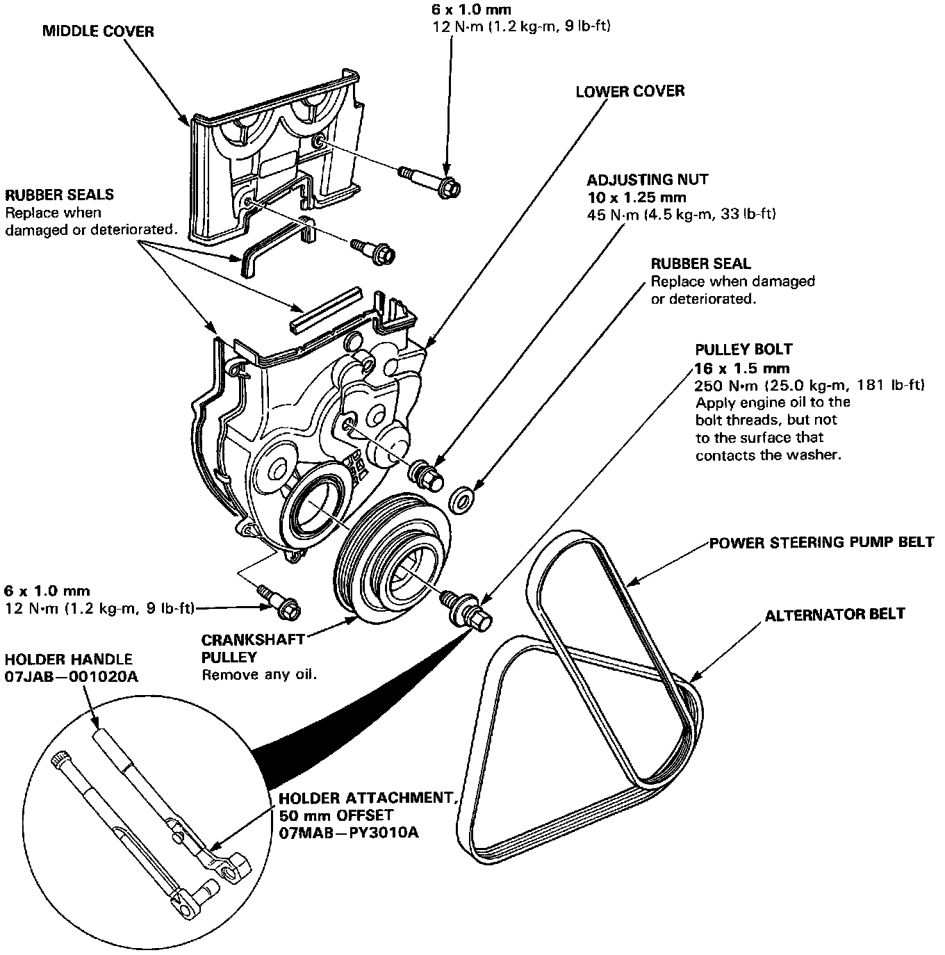 34. Coat the threads and seating face of the pulley bolt with engine oil. Install and tighten to the specified torque.