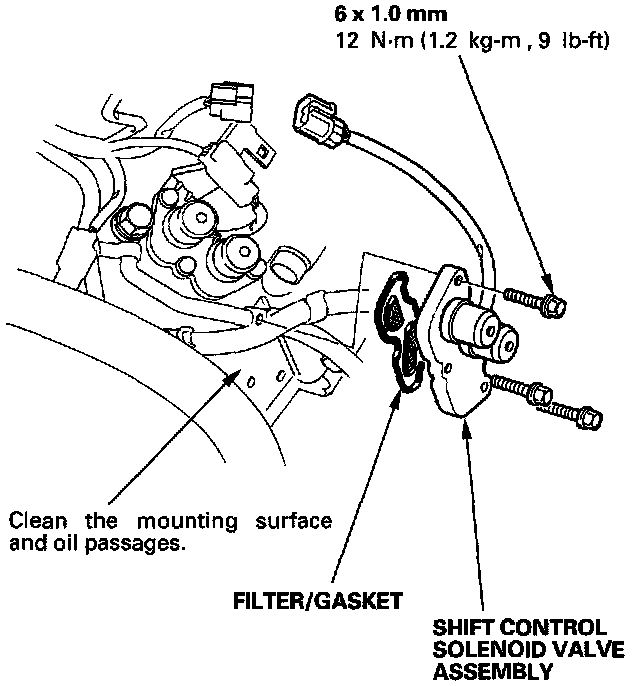 3. Clean the mounting surface and oil passages of the shift control solenoid valve assembly, and install a new filter/gasket.