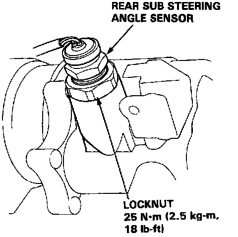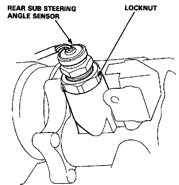 15. Tighten the locknut while holding the rear sub steering angle sensor with a wrench.