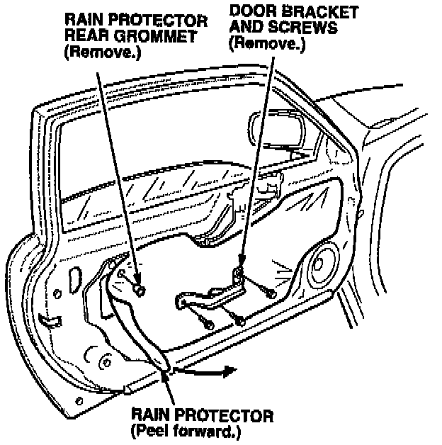 6. Remove the rain protector rear grommet and the door bracket (three screws), then carefully peel the rain protector forward to expose the window regulator mounting bolts.