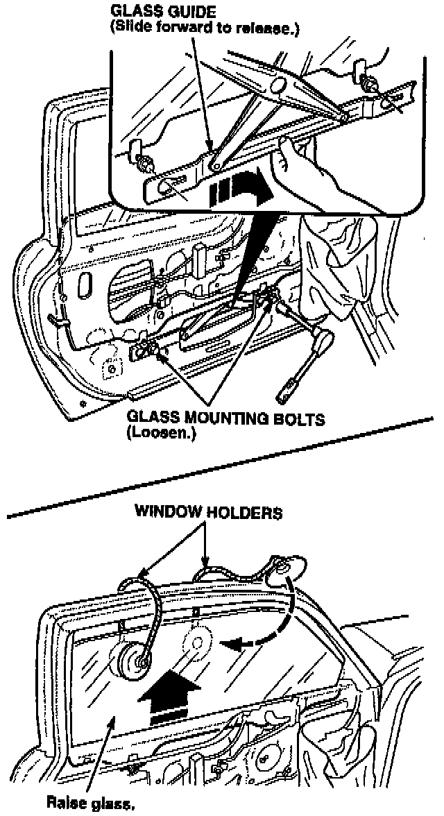 7. Loosen the two glass mounting bolts, and slide the glass guide forward to release it from the glass. Then pull up on the glass, and support it with two window holders (Snap-On P/N YA6390), or use two pieces of 1-1/2-inch-wide (or wider) masking tape.