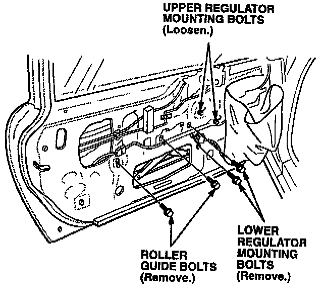 9. Remove the two roller guide bolts and the two lower regulator mounting bolts; then loosen the two upper regulator mounting bolts.