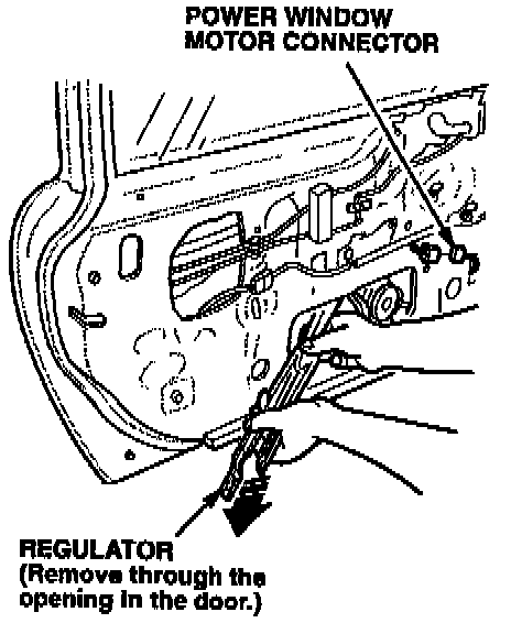 10. Disconnect the power window motor connector, and remove the regulator through the opening in the middle of the door.