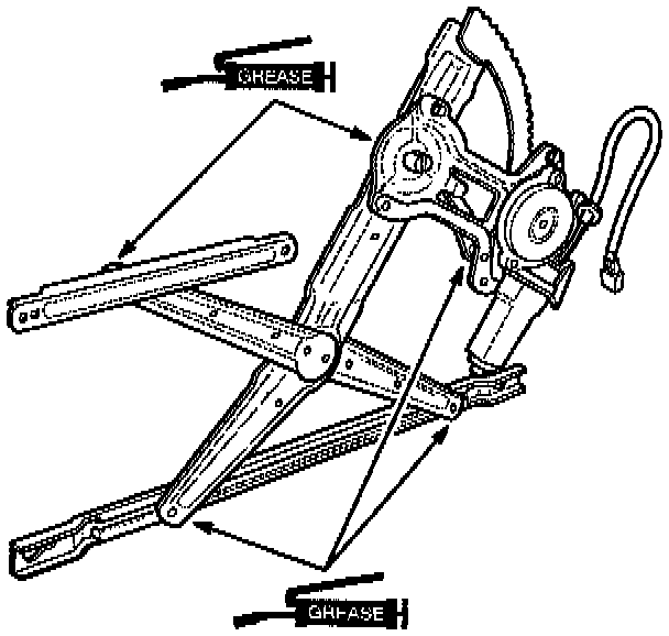 14. Tighten the four regulator mounting bolts and the two roller guide bolts to 8 N.m (6 lb-ft). Tighten the two glass mounting bolts to 6 N.m (4 lb-ft).
