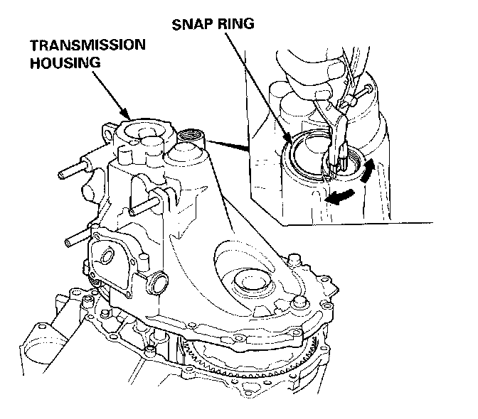 11. Set the stopper ring as shown. Place the transmission housing over the clutch housing, being careful to line up the shafts.