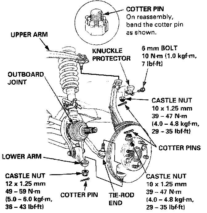 4. Install the knuckle on the tie-rod end, upper arm and lower arm. Tighten the castle nuts and install the new cotter pins.