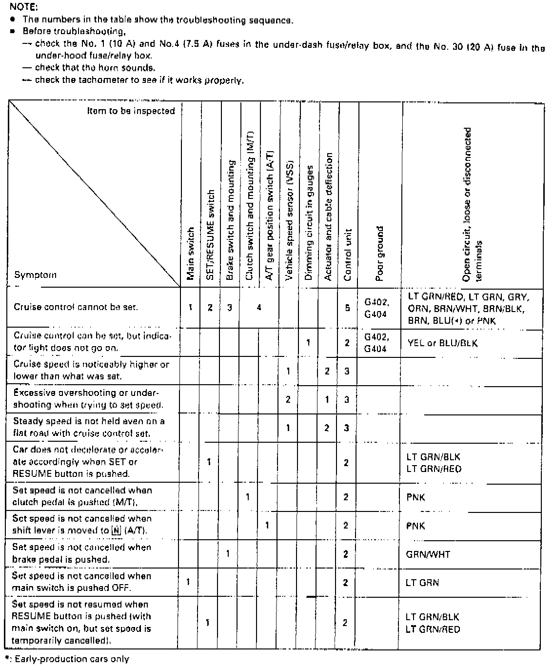 Prior to troubleshooting the speed control system, check the No. 1 (10A) and No. 4 (7.5A) fuses in the fuse box and the No. 30 (20A) fuse in the underhood fuse/relay box. If fuses are operating, ensure horn sounds and tachometer functions properly. Refer to troubleshooting sequence, Fig. 2.