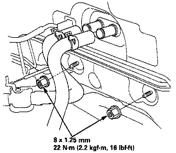 NOTE: Engine coolant will run out when the hoses are disconnected; drain it into a clean drip pan.