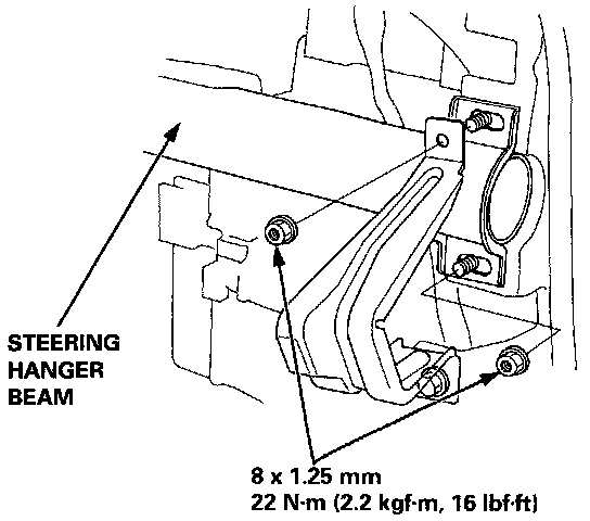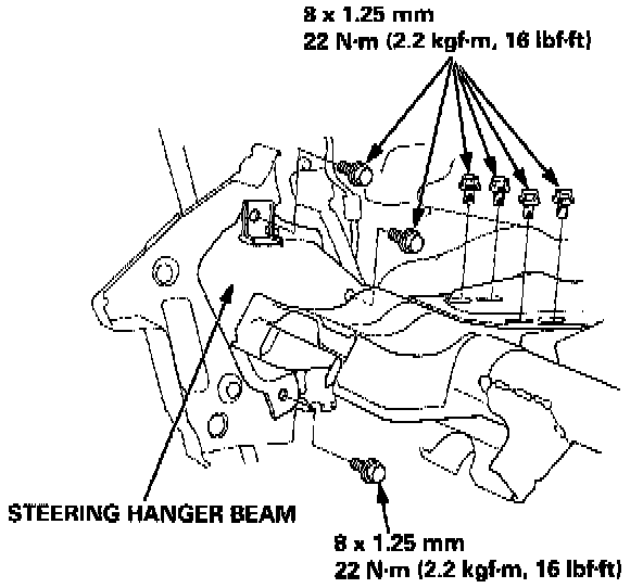6. Remove the mounting bolts and mounting nuts in sequence shown, then remove the steering hanger beam.