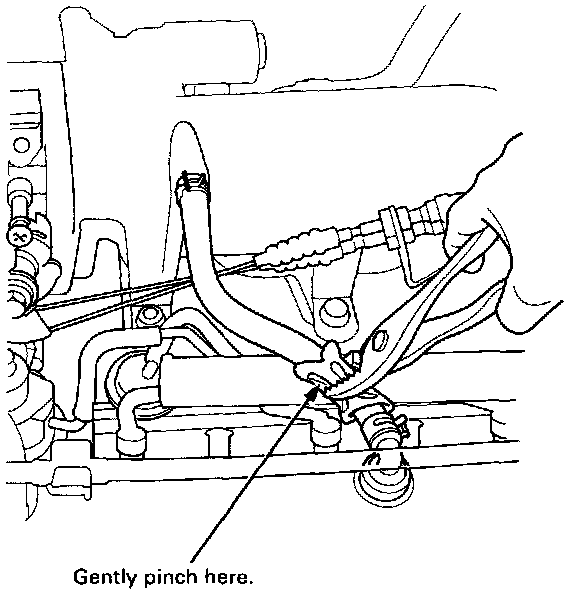 2. At idle, make sure there is a clicking sound from the PCV valve when the hose between the PCV valve and intake manifold is lightly pinched with your fingers or pliers.