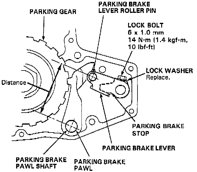 distance between the parking brake pawl shaft and the parking brake lever roller pin.
