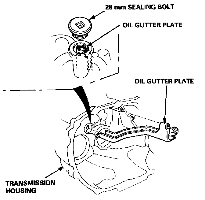 9. Remove the 28 mm sealing bolt, then remove the oil gutter plate.