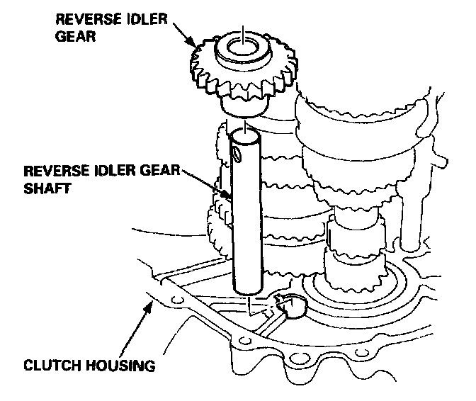 4. Install the reverse idler gear and reverse idler gear shaft in the clutch housing.