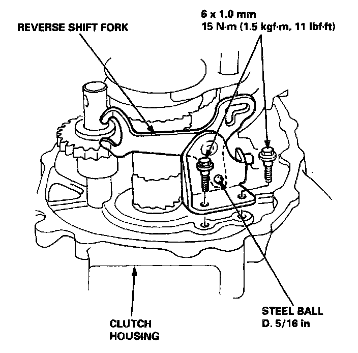 5. Install the reverse shift fork in the clutch housing with the 5th/reverse shift piece pin positioned in the slot of the reverse shift fork.