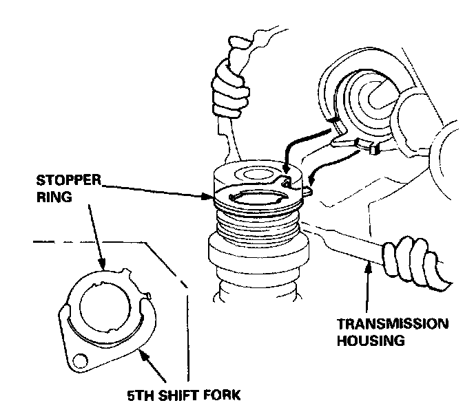 NOTE: Align the long arm of 5th shift fork with the hook on the stopper ring.