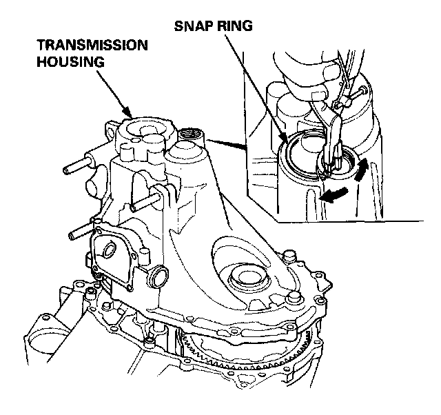 12. Lower the transmission housing with the snap ring pliers, and set the snap ring into the groove of the countershaft bearing.