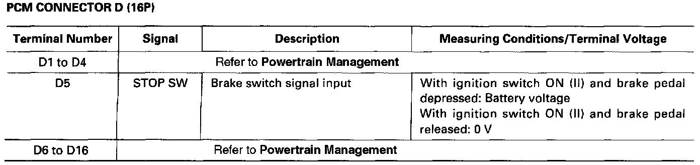 The PCM terminal voltage and measuring conditions are shown for the connector terminals that are related to the A/T control system. The other PCM terminal voltage and measuring conditions are described in Powertrain Management.