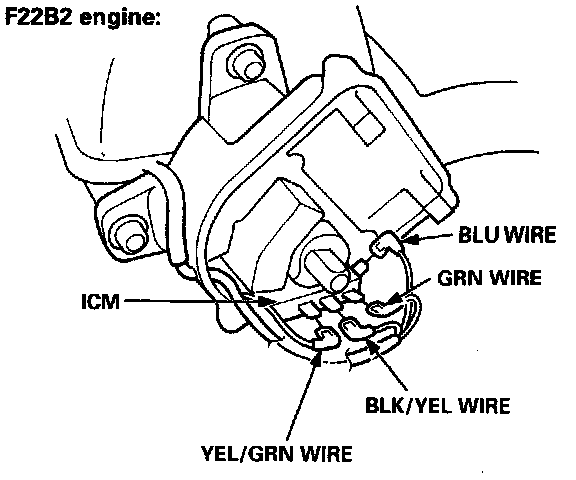 4. Turn the ignition switch ON (II) and check for battery voltage between the GRN wire and body ground. If there is no battery voltage check for proper operation of the ignition coil or for an open in the GRN wire between the ICM and ignition coil. If there is battery voltage proceed to step 5.
