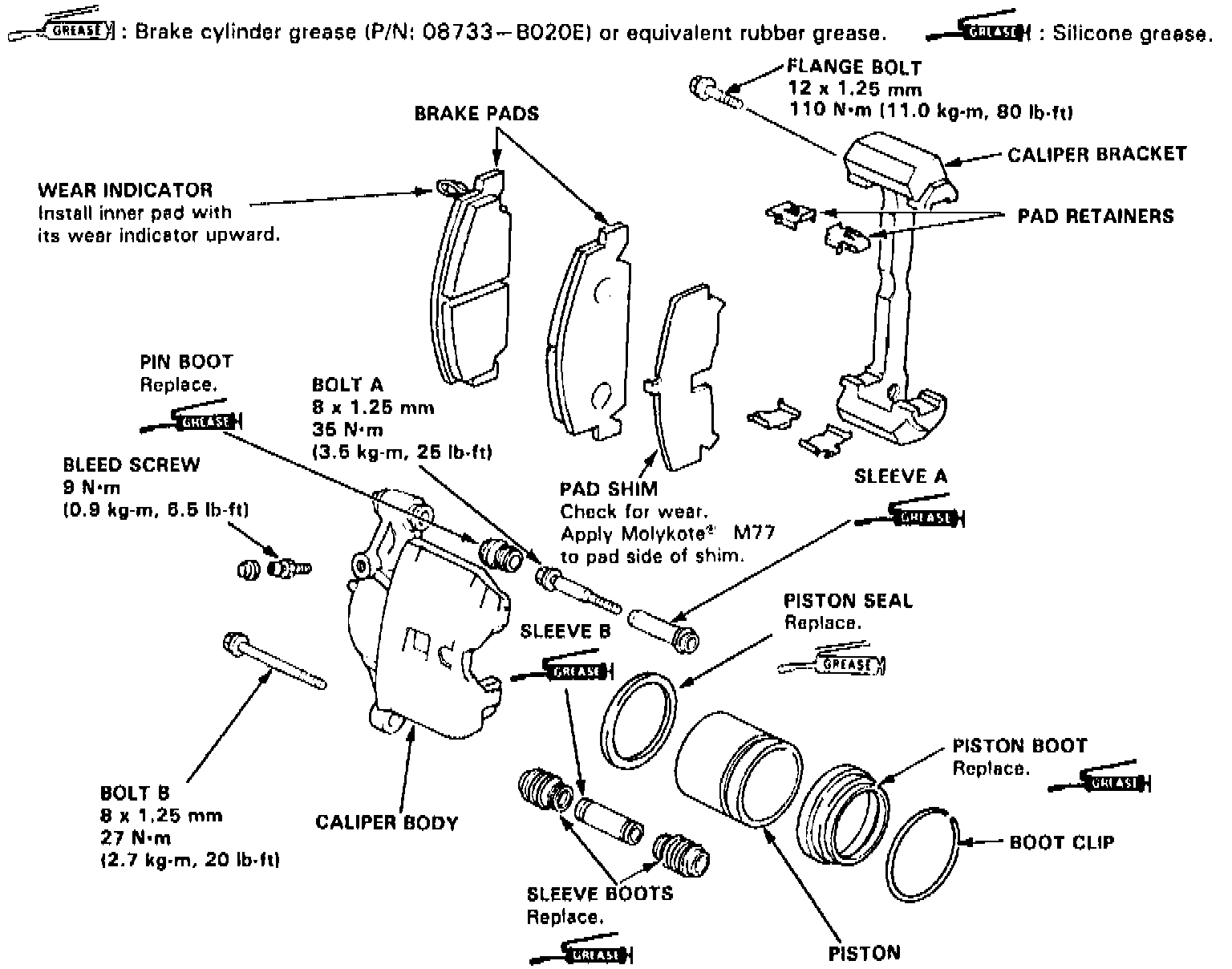 Ensure dirt or other foreign matter is not allowed to contaminate brake fluid. Do not mix different types of brake fluid, as they might not be compatible.Fig. 2 Front Pin Siding Disc Brake Caliper: