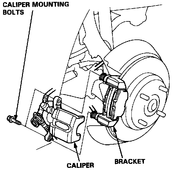 3. Remove the two caliper mounting bolts and the caliper from the bracket.
