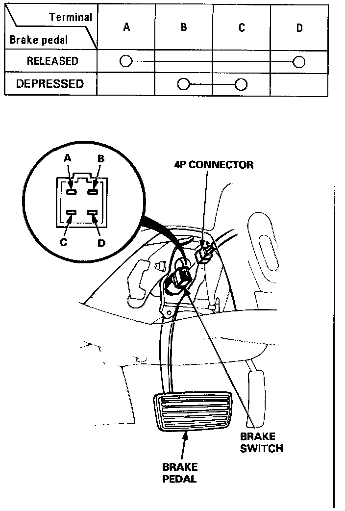 1. Disconnect the 4P connector from the switch.Brake Switch Test:
