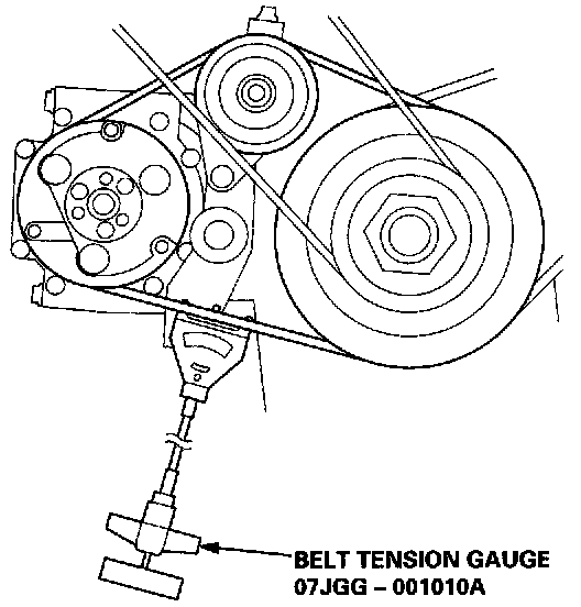 1. Apply a force of 98 N (10 kg, 22 lb), and measure the deflection between the A/C compressor and the crankshaft pulley.