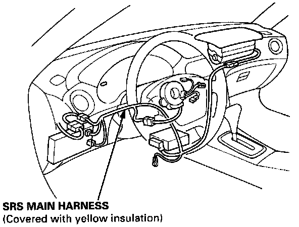^ All SRS wire harnesses are covered with yellow insulation. Before you disconnect any part of an SRS wire harness, disconnect the airbag connectors.