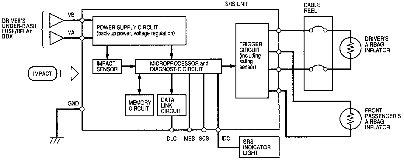 The main circuit in the SRS unit senses and judges the force of impact and, if necessary, ignites the inflator charges. If battery voltage is too low or power is disconnected due to the impact, the back-up power circuit will keep voltage at a constant level.