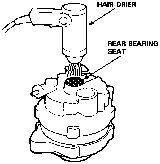 2. Heat the rear bearing seat with a 1,000 W hair drier for about five minutes (120 - 140° F, 50 - 60° C).