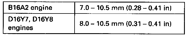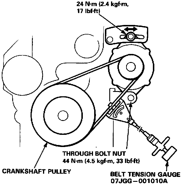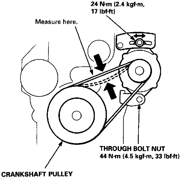 Apply a force of 98 N (10 Kgf, 22 lbf) and measure the belt deflection between the alternator and the crankshaft pulley.