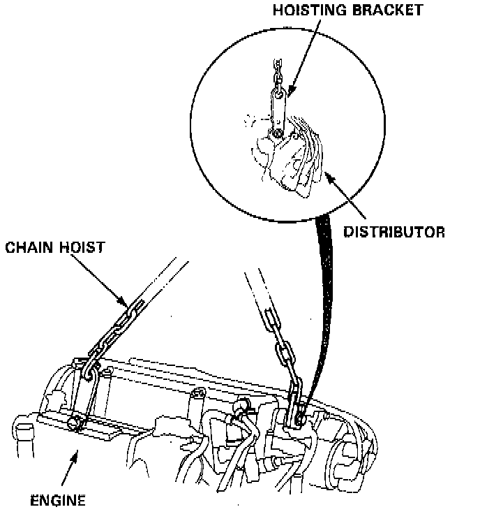 22. Attach a hoisting bracket to the engine using the distributor mounting bolt, then lift the engine slightly.