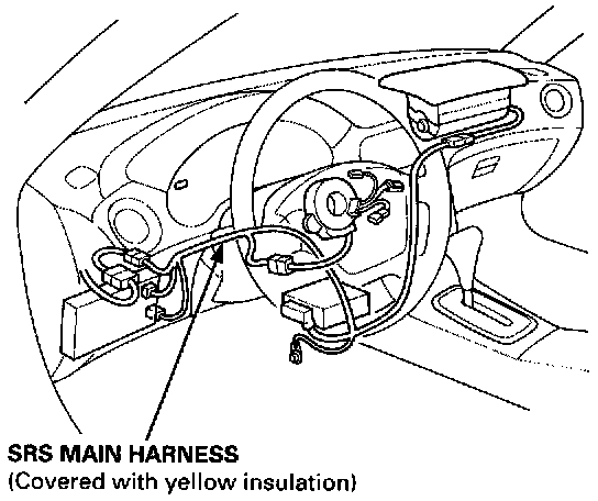 ^ All SRS wire harnesses are covered with yellow insulation. Before you disconnect any part of an SRS wire harness, disconnect the airbag connectors.