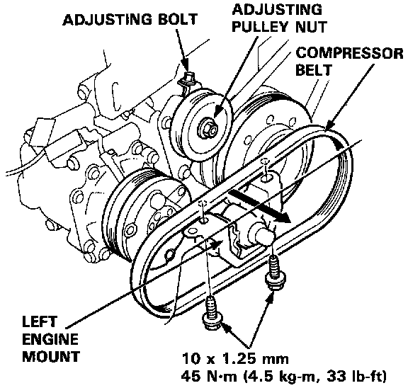 5. Loosen the adjusting pulley nut and adjusting bolt, and remove the compressor belt. Remove the tw0 left engine mount bolts, and pass the belt through the gap between the body and left engine mount.