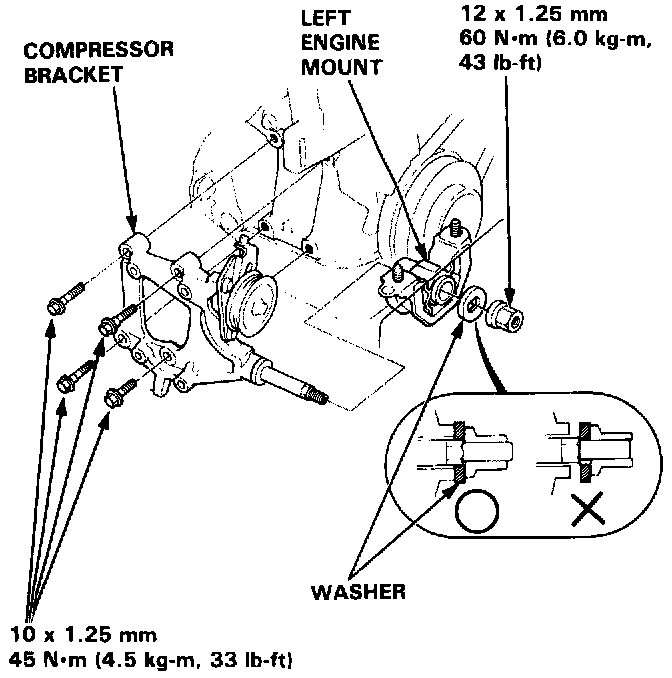 NOTE: When tightening the nut of the left engine mount, make sure the washer is set properly on the left engine mount as shown.