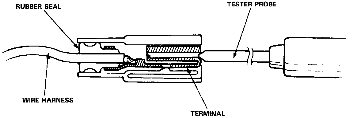 - Bring the tester probe into contact with the terminal from the terminal side of wire harness connectors in the engine compartment. For female connectors, just touch lightly with the tester probe and do not insert the probe.