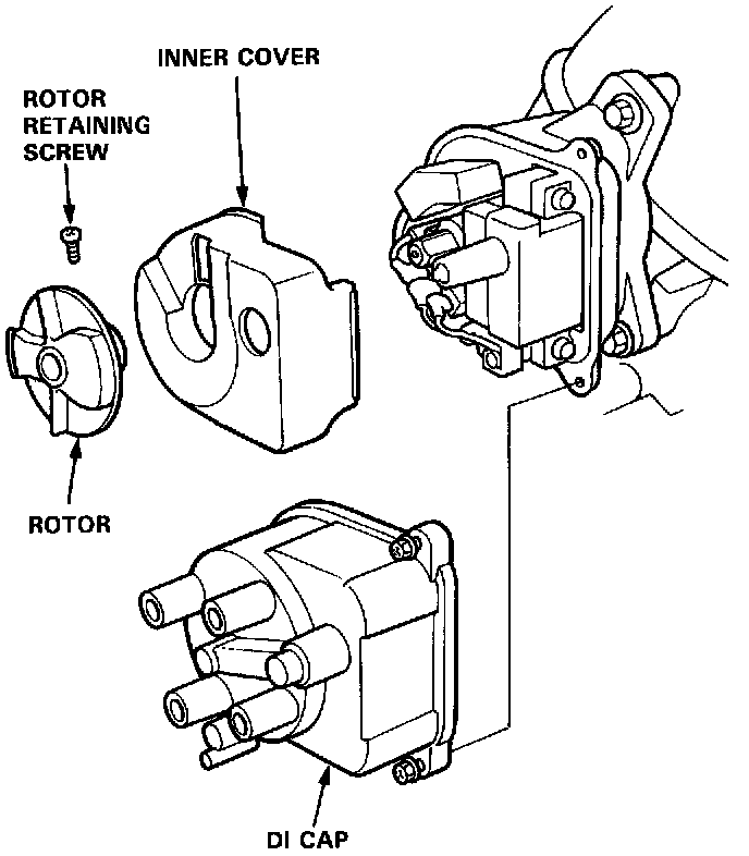 1. With the ignition switch OFF, remove the distributor ignition (DI) cap and rotor, then remove the inner cover.