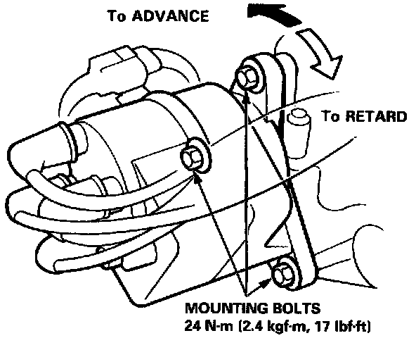 5. If it is necessary to adjust the ignition timing, loosen the distributor mounting bolts, and turn the distributor ignition (DI) housing counterclockwise to advance the timing, or clockwise to retard the timing.