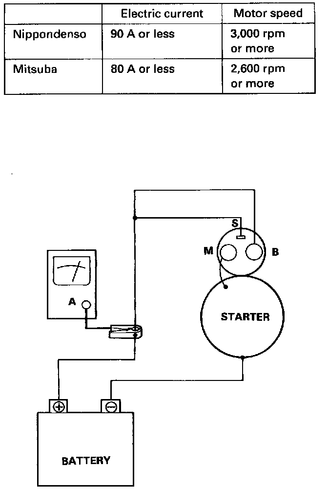 3. If the electric current and motor speed meet the specifications when the battery voltage is at 11 V, the starter is working properly.