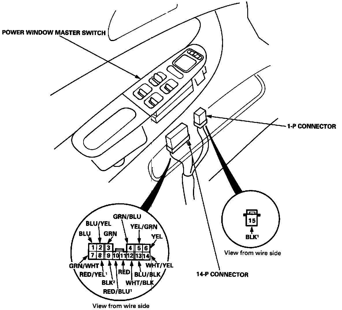 1. Remove the driver's door panel, and disconnect the 14-P and 1-P connectors from the master switch.