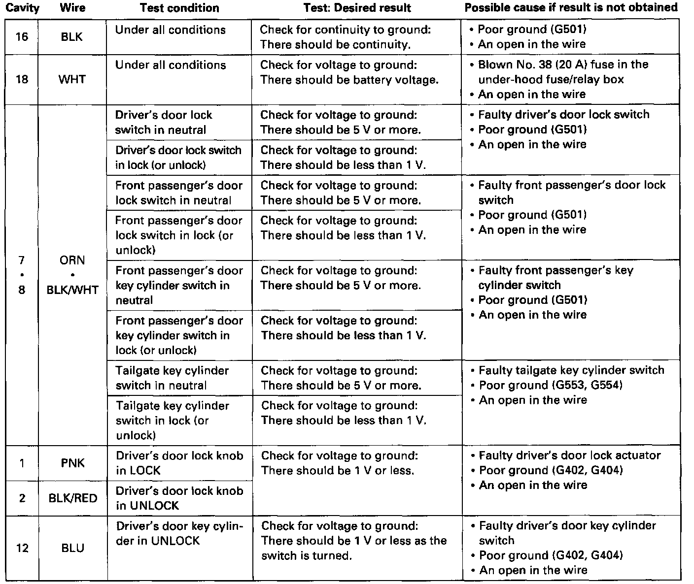 Control Unit Input Test (Without Keyless Entry):