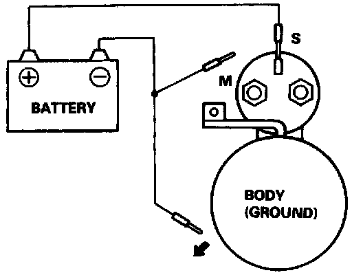 NOTE: Before starting the following checks, disconnect the wire from terminal M, and make a connection as described below using as heavy a wire as possible (preferably equivalent to the wire used for the car).Pull-In Coil Test: