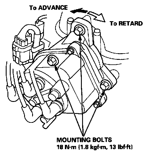 7. Tighten the distributor mounting bolts, and recheck the ignition timing.
