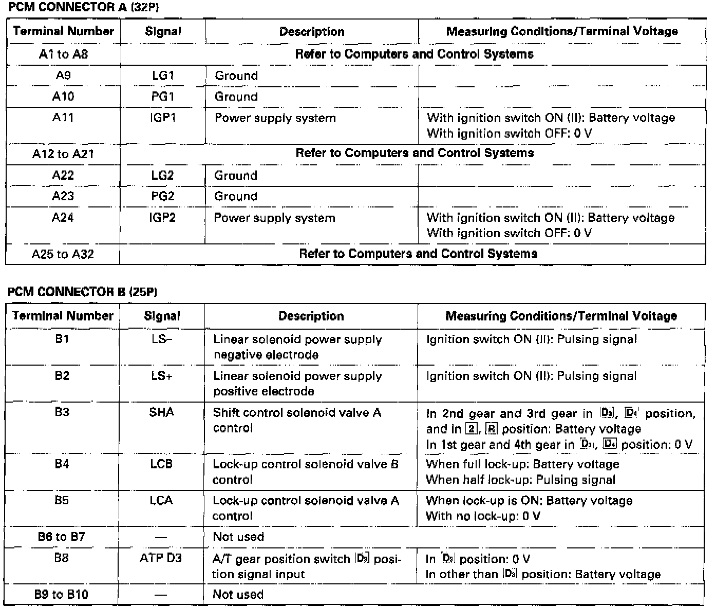 A/T Control System:The PCM terminal voltage and measuring conditions are shown for the connector terminals that relate to the A/T control system. The other PCM terminal voltage and measuring conditions are described under Computers and Control Systems/Normal Scan Data Values.