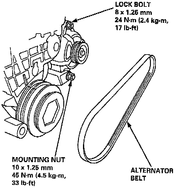 4. Loosen the lock bolt and mounting nut, then remove the alternator belt.