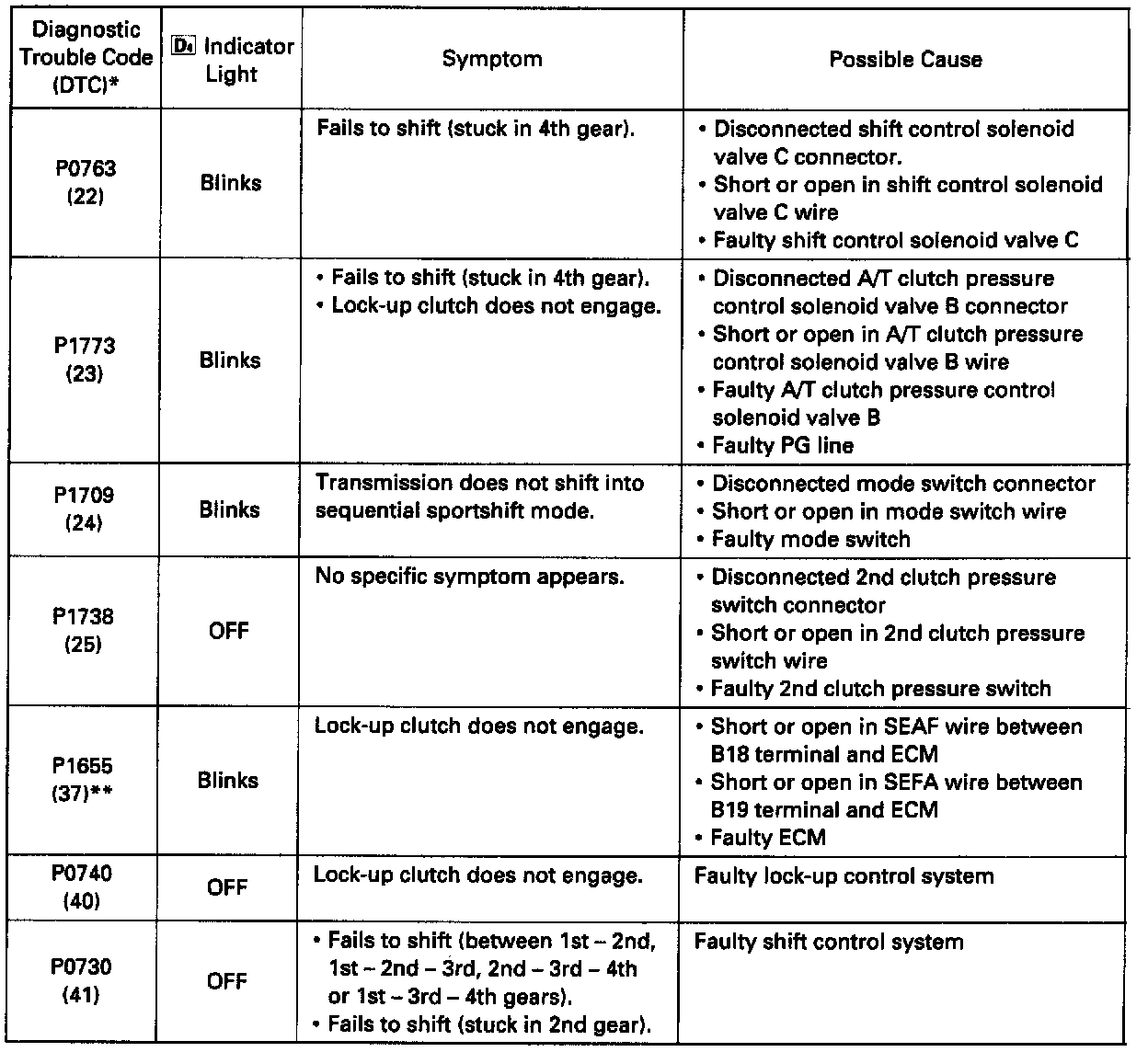 (37)**: Code 37 is caused by a faulty SEAF or SEFA wire between the TCM and the ECM, or a faulty ECM. The [D4] indicator light cannot indicate code 37 even though the service check connector is connected with the special tool.